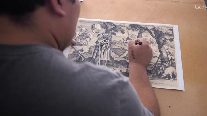 For the exhibition Reinventing the Américas, Baniwa collaborated with the Getty Research Institute to generate video artworks, installations, and interventions on historical objects. His contemporary interventions prompt us to see other sides to these representations. Baniwa says, “When I’m faced with a colonial narrative, I’m provoked to find in it what’s invisible to most people.”